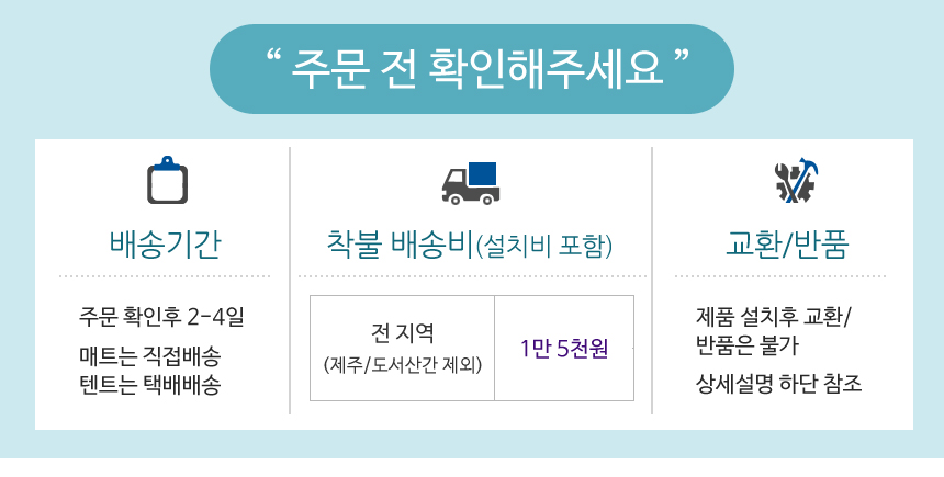 | 배송,설치비용 | 배송비(설치비포함)- 상세설명 참조(지역별 할증)|텐트:택배발송(DIY상품)|기간:주문일로부터 7일~10일 이내(공휴일제외)|묶음 배송 불가 |