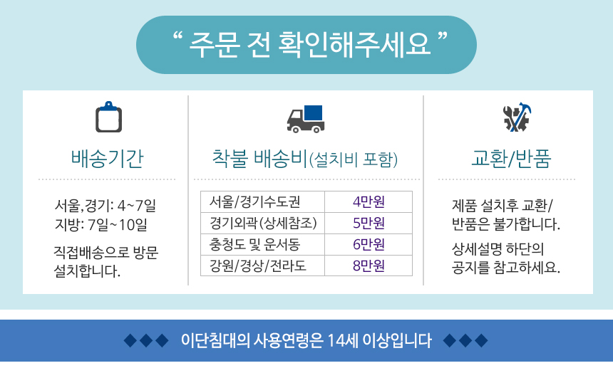 | 배송,설치비용 | 배송비(설치비포함)- 상세설명 참조(지역별 할증) / 주문일로부터 7일~10일 이내(공휴일제외) / 묶음 배송 불가 |